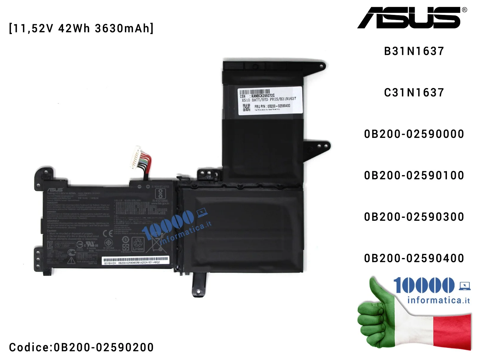 ![0B200-02590200 Batteria B31N1637 C31N1637 ASUS VivoBook X510 S510 S510U [11,52V 42Wh 3630mAh] S510UA S510UN S501UR X510U X510...](https://viaggioltredubbiedisagi.it/5178-large_default/0b200-02590200-batteria-b31n1637-c31n1637-asus-vivobook-x510-s510-s510u-1152v-42wh-3630mah-s510ua-s510un-s501ur-x510u-x510ua-x51.jpg)