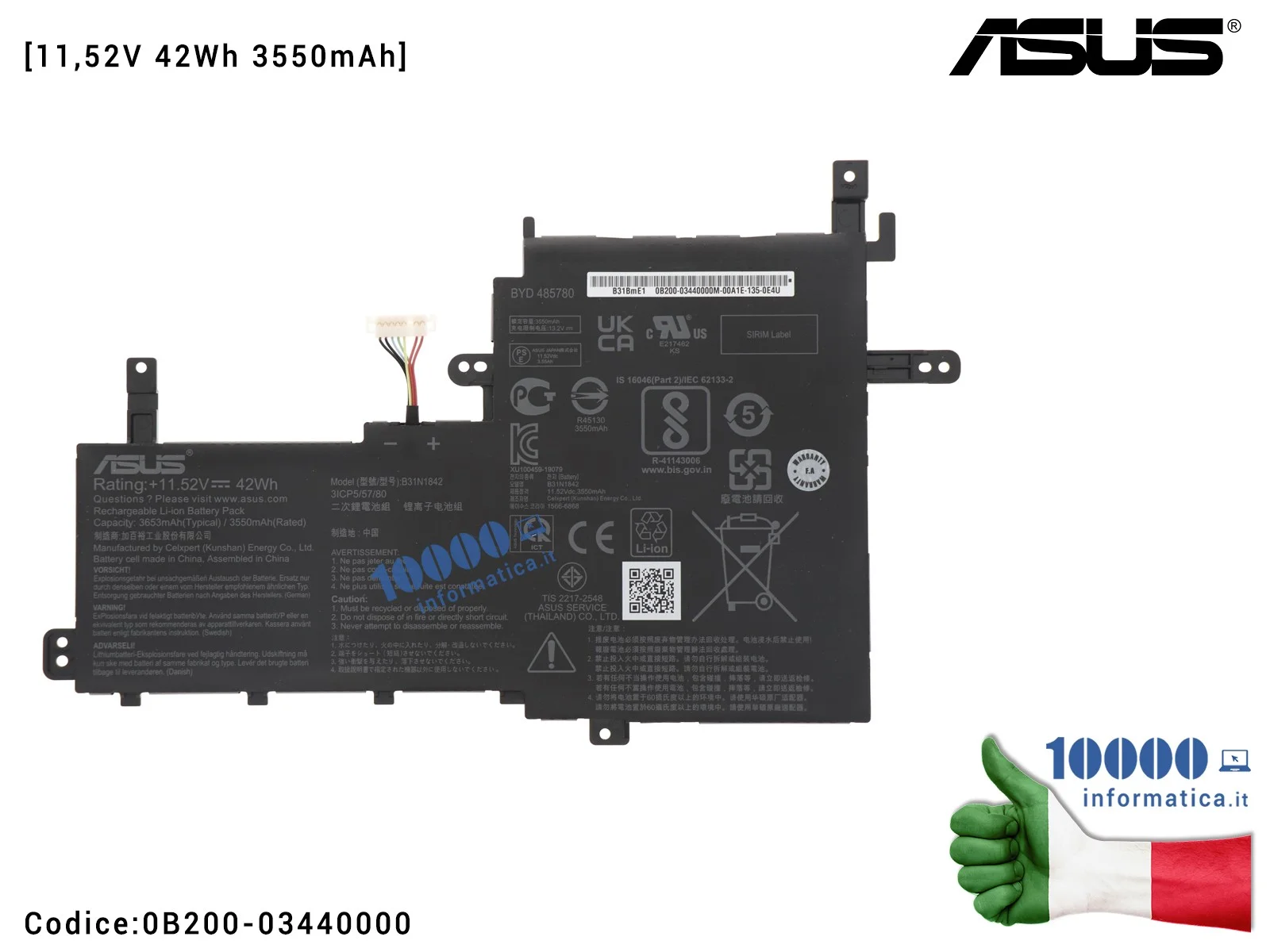 Batteria B31N1842 ASUS VivoBook S15 S531 S531F X531 X513E X513EA X513EP X513EQ X513IA X531F X531FA X531FL [11,52V 42Wh 3550mAh]