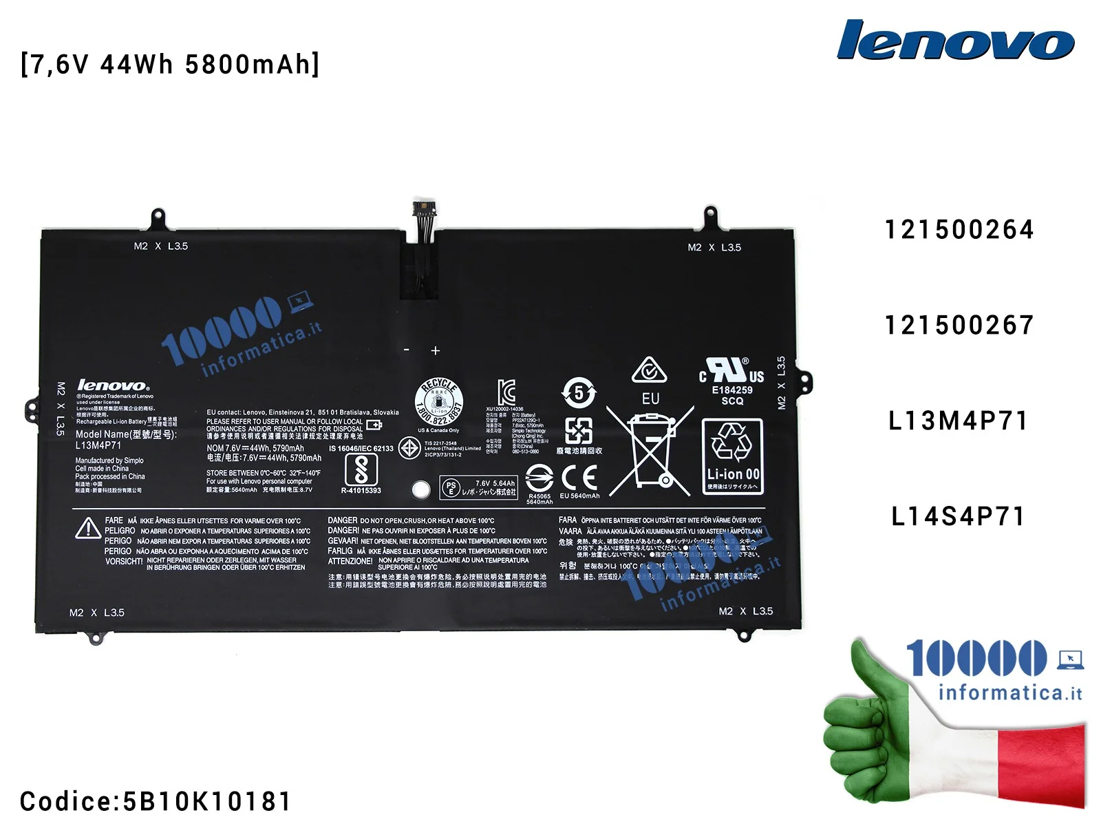 Batteria L13M4P71 LENOVO Yoga 3 Pro 1370 [7,6V 44Wh 5800mAh] 121500264 121500267 L13M4P71L14S4P71