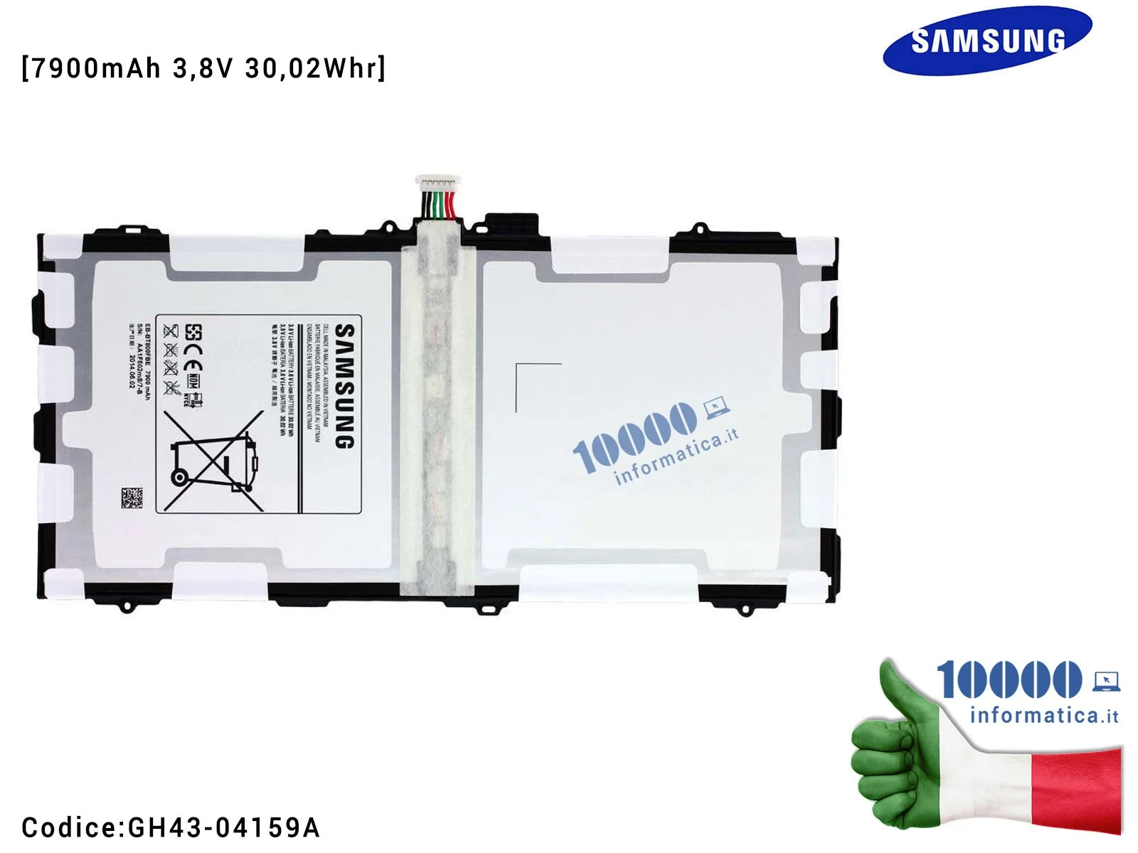 ![GH43-04159A Batteria EB-BT800FBE SAMSUNG Galaxy Tab S LTE SM-T805 SM-T800 [7900mAh 3,8V 30,02Whr] GH43-04159C](https://viaggioltredubbiedisagi.it/1056-large_default/gh43-04159a-batteria-eb-bt800fbe-samsung-galaxy-tab-s-lte-sm-t805-sm-t800-7900mah-38v-3002whr-gh43-04159c.jpg)