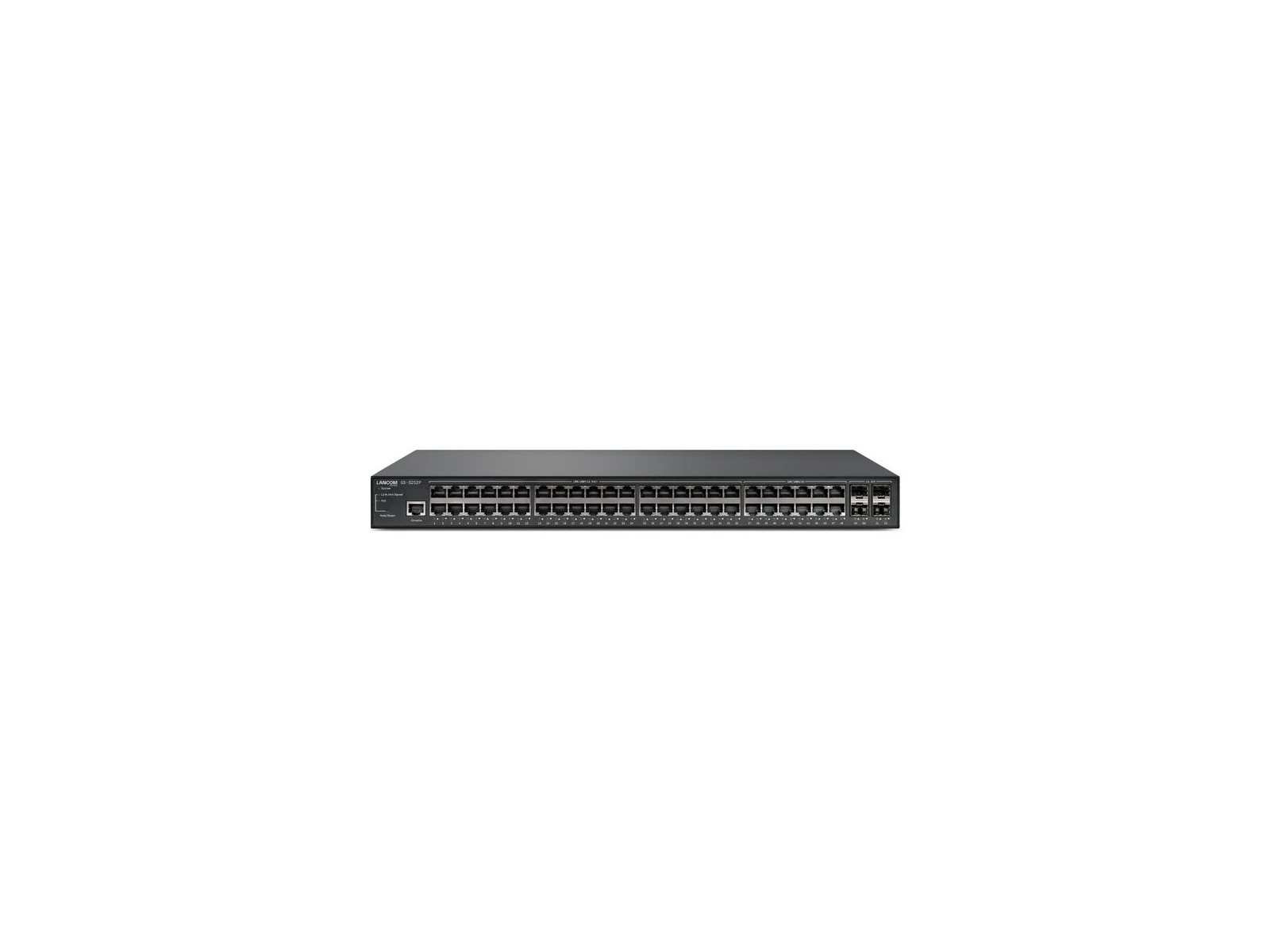 61876 Lancom Systems LANCOM GS-3252P CE/Federal Communications Commission (FCC) LANCOM GS-3252P Managed layer 3 lite access switch, 48 Ethernet ports, 36 with PoE+ (max. 370 W) and 4 SFP+ ports (10G), 176 Gbps throughput, IPv6/IPv4, 4,000 active VLANs, QoS, 802.1X, TACACS+, country spec. IEC power cords available
