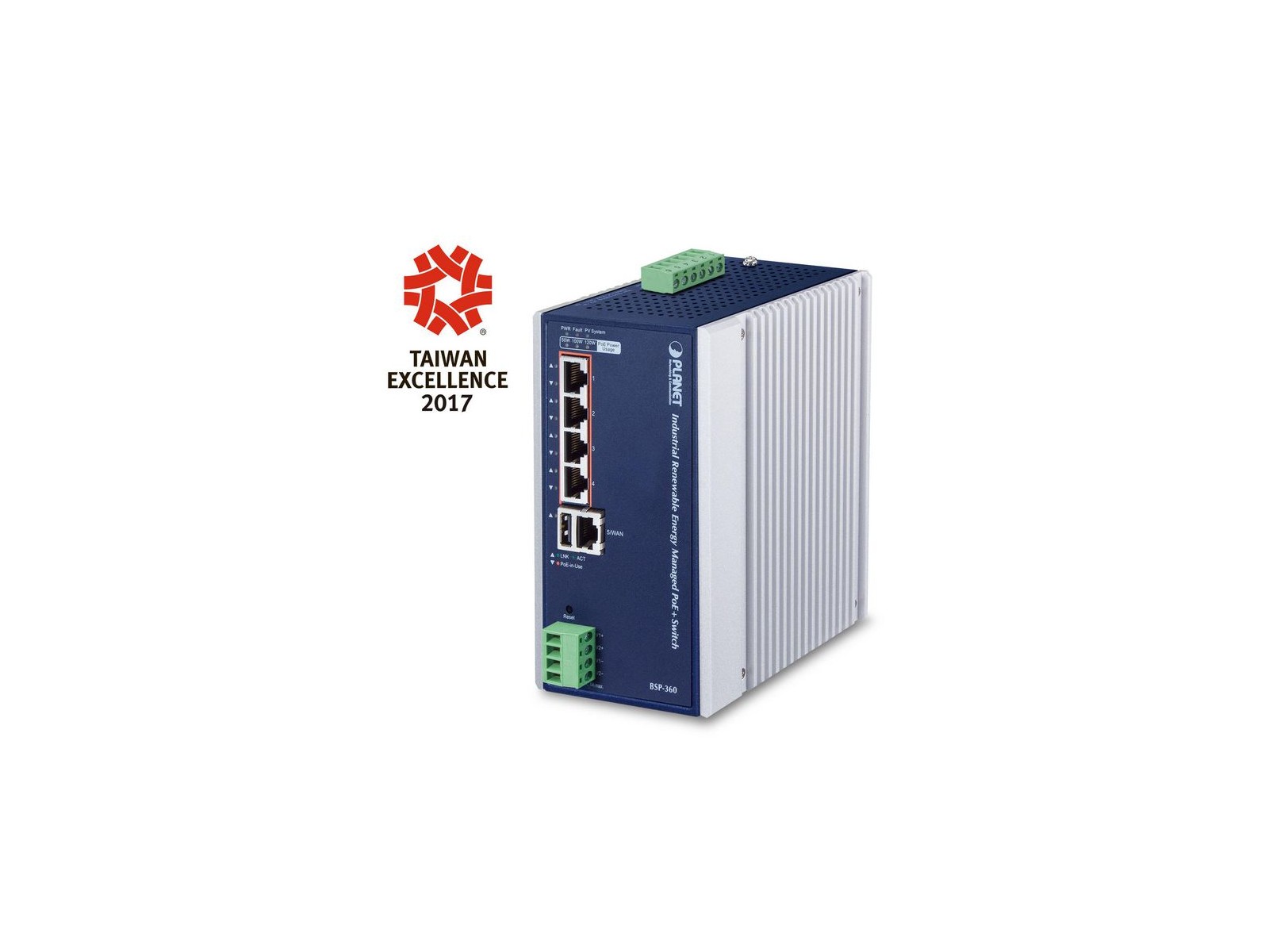BSP-360 Planet Industrial Renewable Power 5-Port Gigabit Managed Switch/Router with 4-Port 802.3at PoE+ NONE - Only use for non-battery items Industrial Renewable Power 5-Port Gigabit Managed Switch/Router with 4-Port 802.3at PoE+