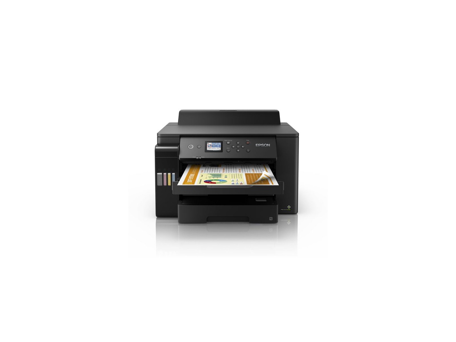 Questa EcoTank ricca di funzionalit? per piccoli uffici e aziende semplifica le attivit? in formato A3 offrendo al contempo un basso costo per pagina. I lavori in formato A3 possono essere eseguiti rapidamente grazie alle elevate velocit? di stampa ai due vassoi anteriori da 250 fogli A3 e all'alimentatore posteriore da 50 fogli A3. Stampa come preferisci con la stampa mobile Ethernet e uno schermo LCD da 6,1 cm. Fai di pi? in meno tempo Questa stampante veloce ed efficiente pu? stampare una prima pagina in appena 5 ? secondi? e velocit? di stampa di 25 ppm in bianco e nero e a colori2. EcoTank A3 ricca di funzionalit? La L11160 ? progettata per stampare fino al formato A3. ? facile navigare nell'ampia gamma di funzionalit? tramite lo schermo LCD da 6,1 cm e i tasti fisici. Continua a risparmiare Risparmia ogni volta che stampi con questa EcoTank che offre un costo per pagina incredibilmente basso. A differenza di altre stampanti EcoTank ? dotata di grandi serbatoi di inchiostro che puoi riempire con flaconi di inchiostro economici.Stampa di qualit? aziendaleL'inchiostro pigmentato ad asciugatura rapida produce stampe senza sbavature e resistenti agli evidenziatori. Con questo inchiostro affidabile e di alta qualit? puoi essere certo che produrr? stampe eccezionali con testo nitido e colori vivaci. Da un set di inchiostri di ricambio puoi produrre fino a 7.500 pagine in bianco e nero e 6.000 a colori3.Stampa da quasi ovunque? facile stampare da cellulari tablet e laptop utilizzando EcoTank. Con Wi-Fi e Wi-Fi Direct puoi inviare documenti da stampare da dispositivi intelligenti utilizzando l'app Epson iPrint4.Facile da usare e affidabileIl riempimento dei serbatoi di inchiostro ? semplice con i flaconi di inchiostro richiudibili intuitivi e antigoccia. L'esclusiva tecnologia PrecisionCore Heat-Free di Epson offre maggiore affidabilit? tempi di inattivit? ridotti e minore impatto ambientale. Nessun tempo di riscaldamento e la prima pagina viene stampata rapidamente utilizzando meno energia.