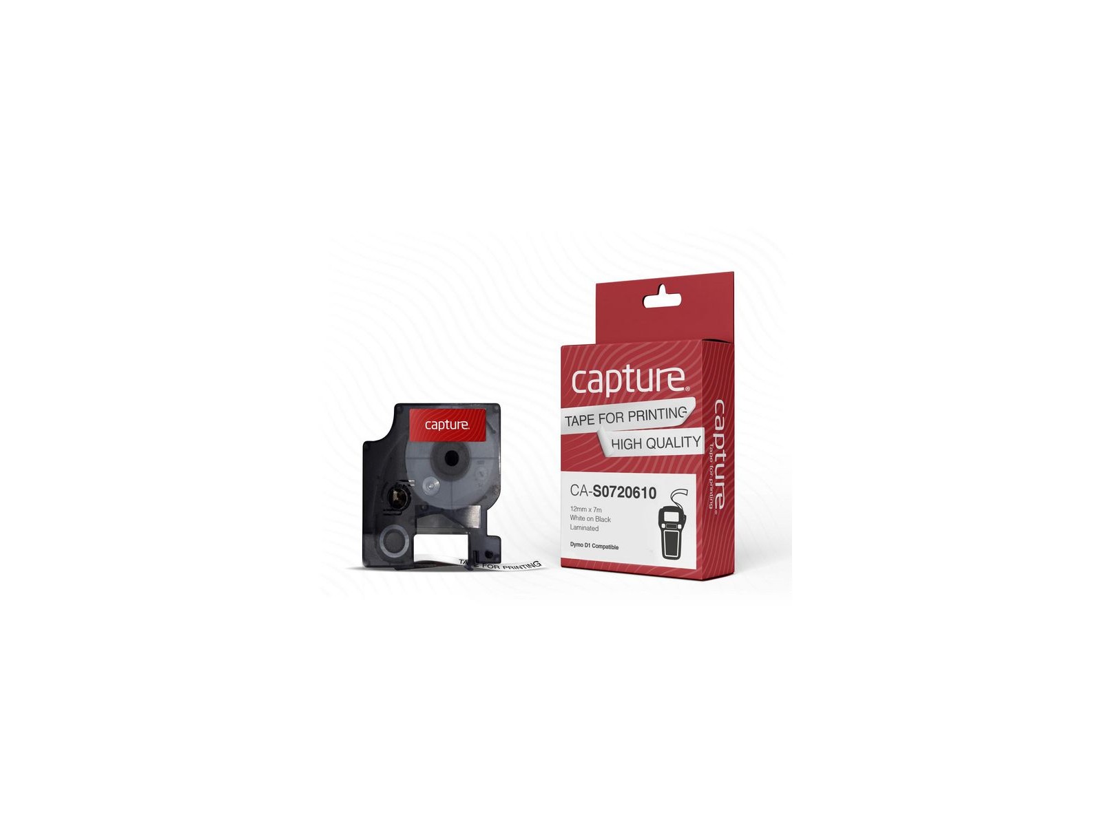 CA-S0720610 Capture 12mm x 7m White on Black Tape. D1 compatible. S0720610; 45021 DYMO 12mm x 7m White on Black Tape. D1 compatible.