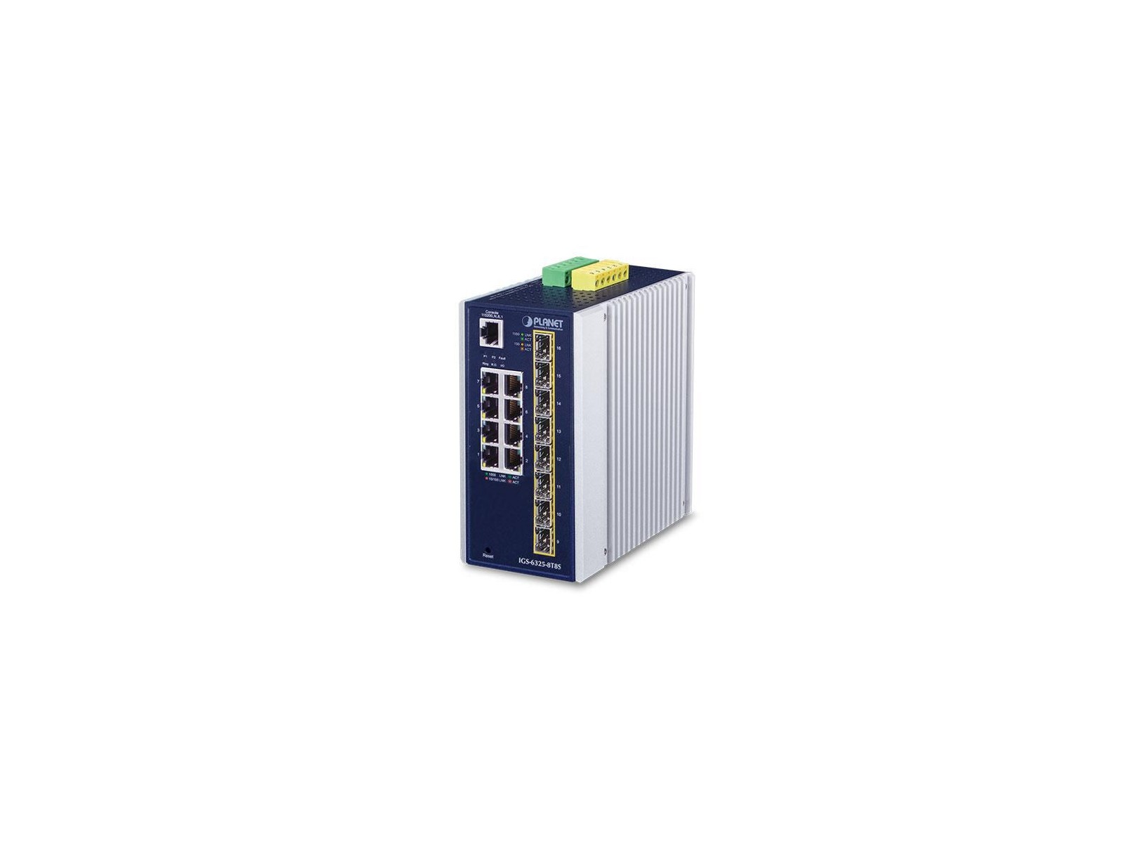 PLANET IGS-6325 Industrial Layer 3 Managed Non-PoE Switch series features 8 10/100/1000BASE-T Copper ports, 8 extra 100/1000/2500BASE-X SFP fiber ports and Layer 3 IP routing in a rugged IP30 metal case for stable operation in heavy industrial demanding environments.