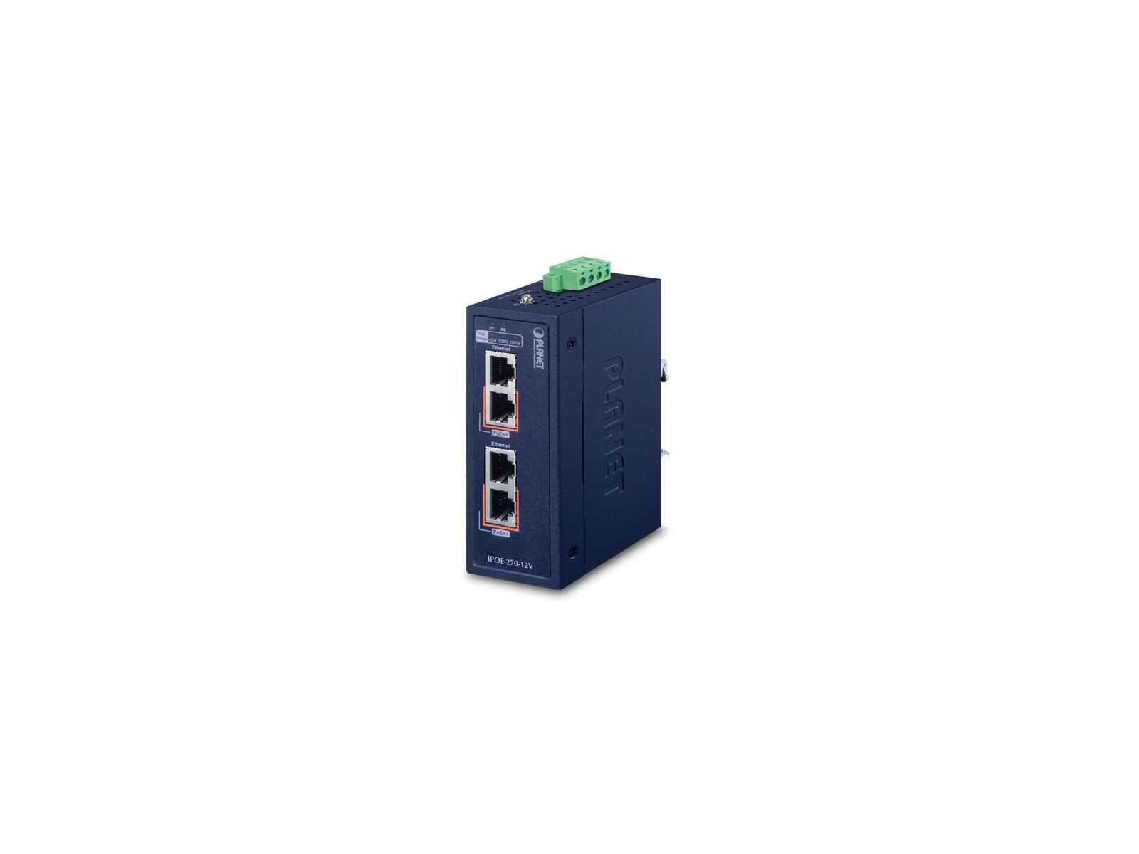IPOE-270-12V Planet 4x 2.5G/5G RJ-45, DIN, PoE, 12V, IP30, 41x70x115 mm FCC 15 A, CE 4x 2.5G/5G RJ-45, DIN, PoE, 12V, IP30, 41x70x115 mm
