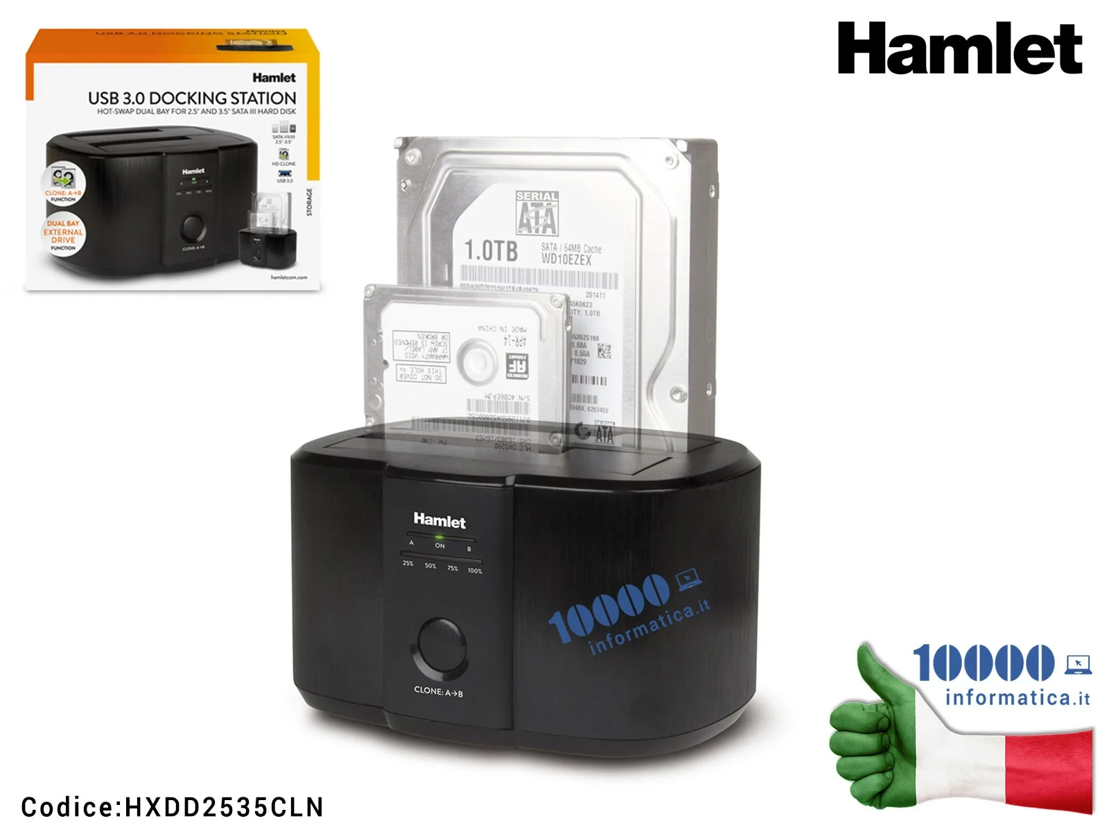 Hamlet USB 3.0 Docking Station offre un modo rapido e semplice per collegare contemporaneamente due dischi SATA da 2,5" o 3,5" alla porta USB del computer senza bisogno di installare il disco all'interno del PC o in un box esterno. Inoltre la funzione di Clonazione permette di duplicare i dati da un disco rigido ad un altro con la sola pressione di un tasto e senza bisogno del computer. Grazie alle funzioni Plug and Play e Hot-Swap, basta inserire l'hard disk nella docking station per accedere velocemente ai dati o aumentare la capacità di archiviazione del computer.